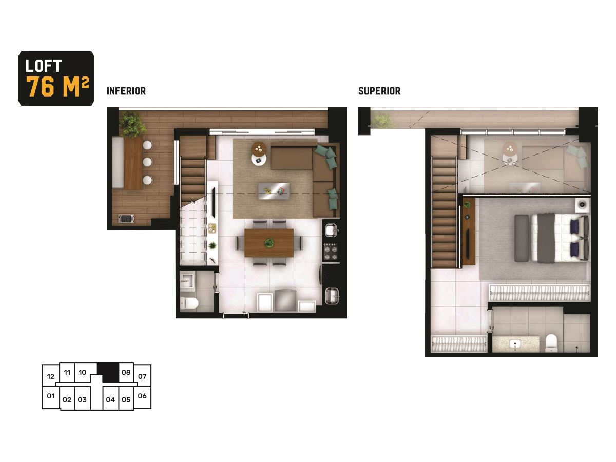 Apartamento Loft com 1 suíte sendo; Piso inferior com sala 2 ambientes, cozinha americana, área de serviço, lavabo, varanda balcão e varanda gourmet c/churrasqueira a gás. Piso Superior com 1 suíte.