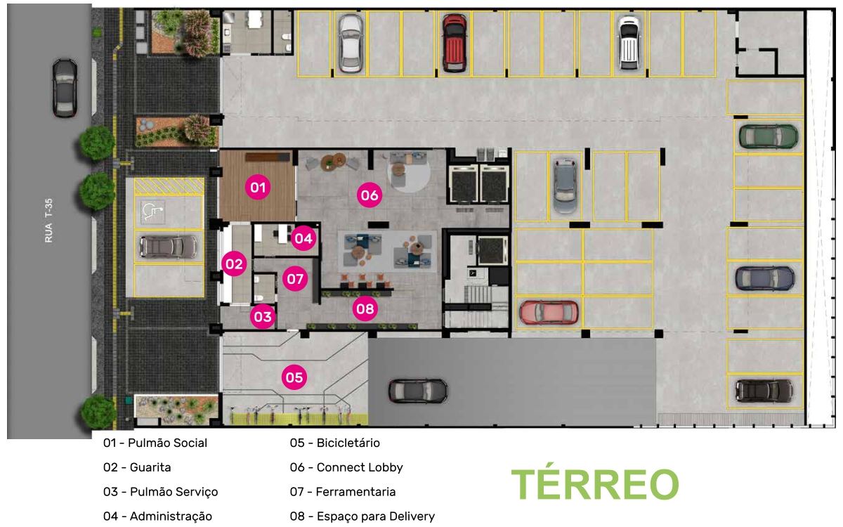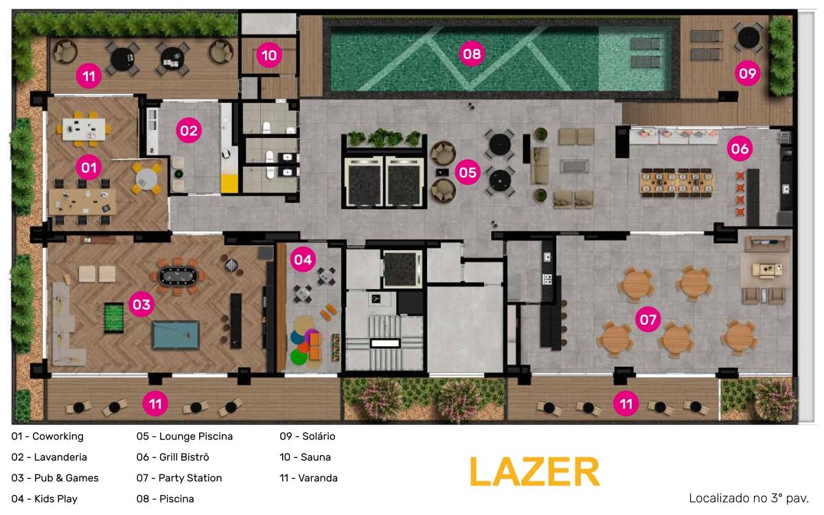 Possui térreo com entradas sociais e de serviço, bicicletário e bike share eletrificado, espaço delivery e ferramentaria. O Mezanino conta com coworking com varanda, lavanderia, pub & games, kids play, piscina com solário e lounge, sauna, grill bistrô, salão de festas com varanda. O terraço/rooftop conta com academia com uma mega varanda(+ 100m²), spa, lounge grill com varanda e lounge gourmet com varanda.